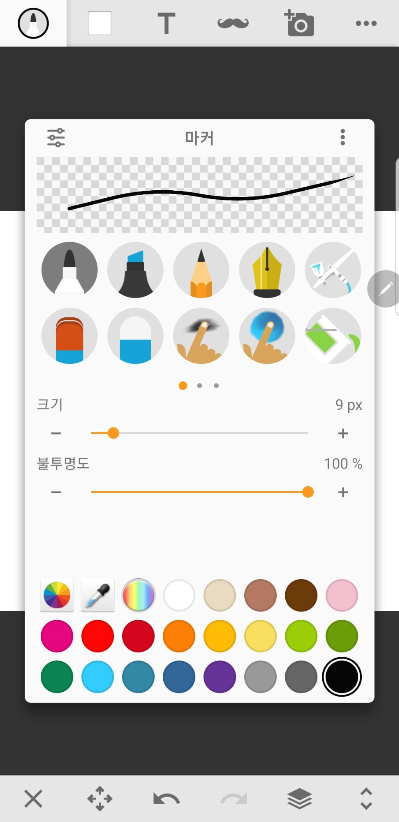 왼쪽상단에 그리는 도구를 선택하고 크기와 색깔을 선택한다음