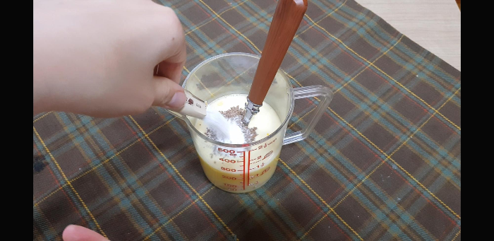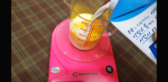바로 저울에 올려 우유를 150g 넣어준다.