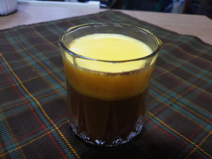 이제 준비된 에그크림을 잔 벽을타고 살살 미끄러지듯 부어준다.부어준 다음 기호에따라 카카오 파우더를 뿌려줘도 괜찮다고 카더라..ㅋ (나는 본연의 맛을 즐기겠어..)
