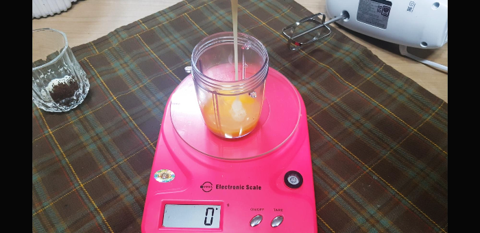 다음은 거품을 낼 용기에다 노른자만 분리해서 2개를 넣어주고 저울위에 올리고 0을 맞춘다음 연유를15g~20g 넣어준다.(여기서 설탕을 추가로 조금 넣어줘도 되지만 나는 넣지않았다)