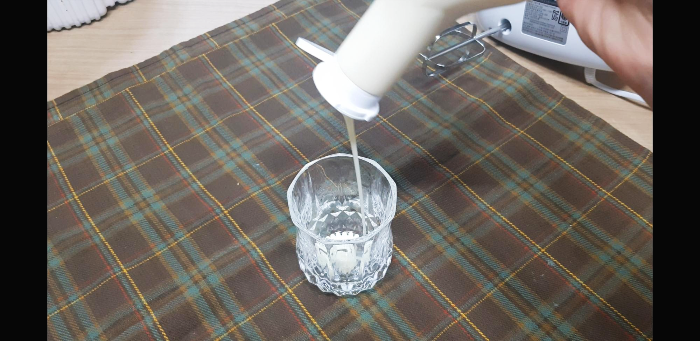 드디어 핸드믹서나 전동거품기로 거품을 내주는데 어느정도 높이가 올라올때까지 휘핑해준다.뭐든지 적당한게 좋은법 너무오랫동안 돌리면 진짜 거품처럼 음료위에 둥둥뜰수 있으니 살짝되직걸쭉?정도로만 거품을 내준다.적당하게 커피와 같이 입안으로 들어갈 수 있을정도.