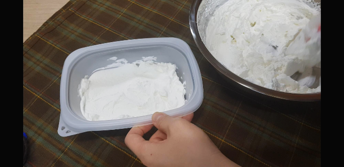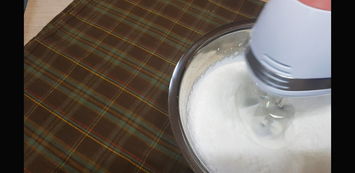 핸드믹서나 도깨비방망이로 단단하게 휘핑해준다.