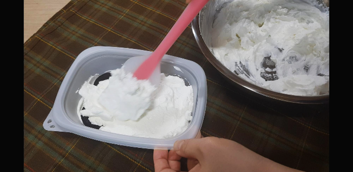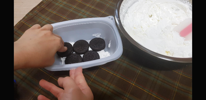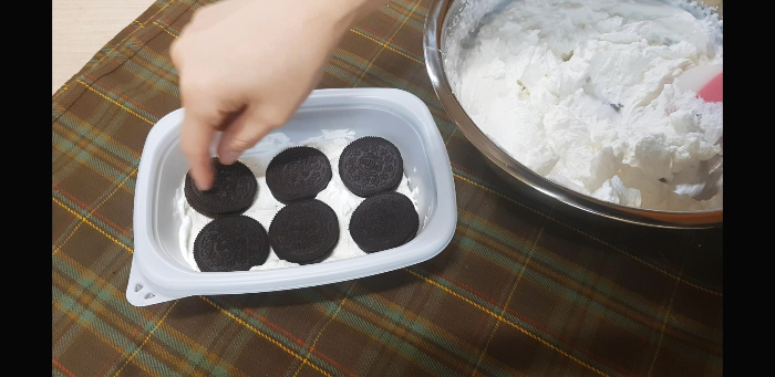 케익을 담을 용기에다 쿠키를 살짝이라도 고정 시킬 수 있도록 생크림을 살짝 밑바닥에 깔아준다.(투명하고 예쁜 유리락앤락에 하고싶었는데..그런거없어서 걍 일회용 용기로 사용함..)