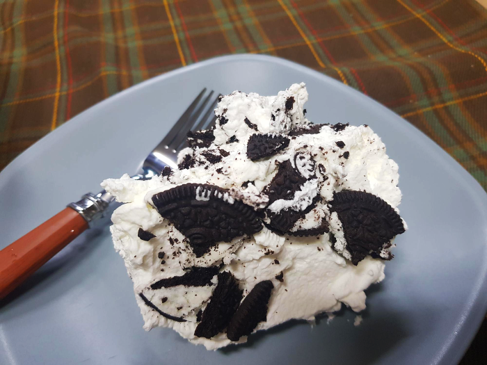 최소 6시간후에 냉장고에서 꺼낸다음 접시로 꺼내보았다.케익삽이 없어서 모양새가 덜 예쁘지만..원래 아이스박스케이크는 스푼으로 막 퍼먹는 재미아입니까?ㅋㅋ 일부를 덜어내고 단면을 보니 나름 층층이 자리잡고 있는 오레오들이 보인다.뿌듯. 이건 개인적인 생각이지만 투썸에가서 아이스박스를 먹었을땐 초반부에는 맛있어서 노래가 나오는데 후반부에가서는 난 좀 느끼하다는 생각이 들어서 혼자 다 먹기는 좀 느끼하다는 생각을 했었는데 생크림으로 하니까 느끼함이 덜하고 오히려 나는 괜찮았다.이정도면 썩세스지.맛있으면 몇칼로리? 0칼로리.레시피 간단 혼잣말 잔뜩. 초초간단 아이스박스케이크 만들기 끄읕.