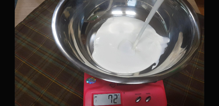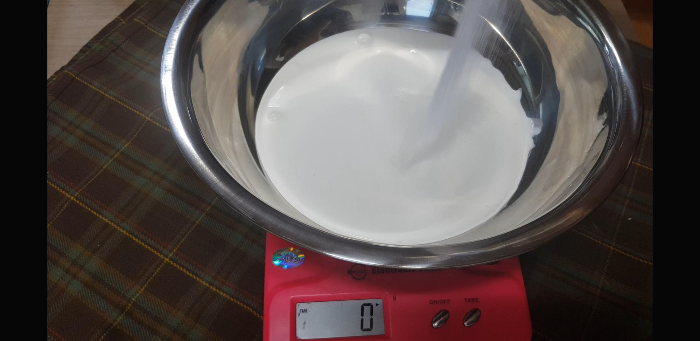 저울위에 믹싱볼에다 생크림을 350g정도 담아준다.(해보니까 살짝 남는 양이라서 300g정도 해도될듯)
