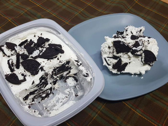 오레오를 깔아 주었다면 위에 생크림으로 넉넉히 덮어주고 그위에 또 오레오를 깔아주고 또 그위에 생크림을 넉넉히 덮어주고를 반복한다.(2통으로 하니까 3층정도 나왔다.)마지막에 남은걸로 잘게잘게 손으로 조각내서 데코를 위에 솔솔 뿌려준다.(케이스가 안예뻐서그렇지..케이스만 예뻣다면..ㅋ) 데코까지 완성했으면 밀봉한 다음에 잠시 이별하는시간.. 냉장고에 6시간이상?넣어두고 기다림의시간..바이바이..