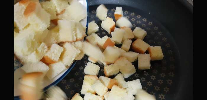 이제 후라이팬을 준비해서 구워주는데 식용유나 버터 없이 아무것도 없는 후라이팬 그대로 가스렌지를 켜고 손질한 식빵을 와르르 부어준다.