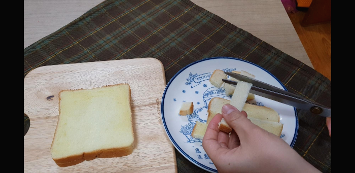두번째는 식빵 츄러스.팝콘과 동일한 방법으로 가위를 사용해 길쭉하게만 컷팅해준다.