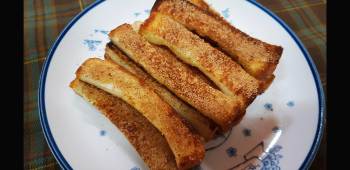 다 구워졌으면 황설탕과 계피가루를 같은 비율로 준비해둔 츄러스용 설탕을 골고루 묻혀준다.아무래도 바삭하게 구워진 식빵이라 그런지 쉽게 설탕이 묻혀지진 않는데 적당하게 스푼으로 떠서 끼얹듯이 올려준다.나는 손으로 조금씩 집어서올려줬음.(아.백설탕도 안되는건 아니다 가능.)