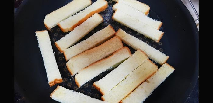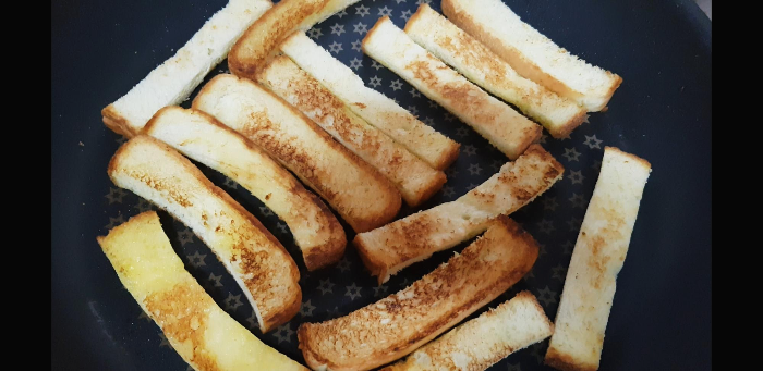 손질한 식빵을 노릇노릇 바삭바삭 하게 뒤집어가며 구워준 다음 한쪽에 대기시켜 놓는다.(식빵부스러기 많음주의.정리해준다..)