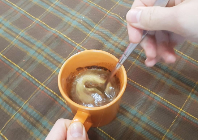 전자렌지에서 녹인 초콜릿과 버터를 스푼으로 골고루 섞어준다. 여기서 나는 이 컵 보다 좀더 괜찮은 컵이 있었는데 옮길까 고민하다가 설겆이 귀찮아서 그냥 바로 진행했는데 만약 여기서 예쁜 용기에 담고 싶으신 분은 초콜릿을 다 저어주고나서 예쁜 용기에다 옮겨담으면 됨!!