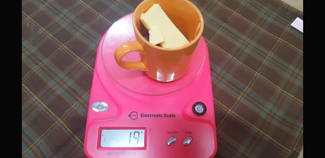 다음으로 저울을 0맞추고 버터를 20g 넣어주고 전자렌지로 이송한다. 전자렌지에서 중탕없이 버터와 초콜릿을 녹여줄거기 때문. 1분 내외로 돌려줌.(버터의 녹은 상태에 따라 초콜릿의 두께에 따라 30초에서 왔다갔다 추가로 돌려주기)