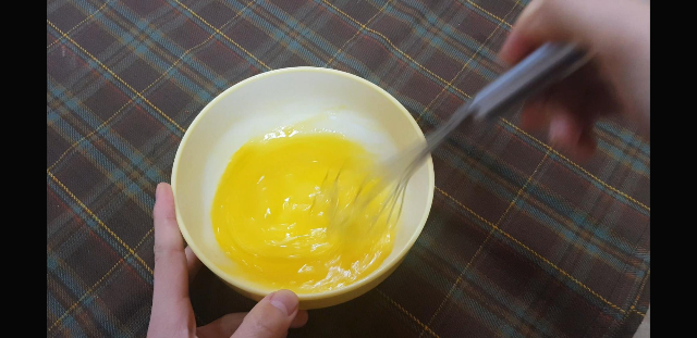 우선 계란 하나를 깬 다음 거품기로 잘 풀어준다.