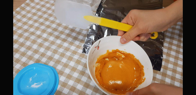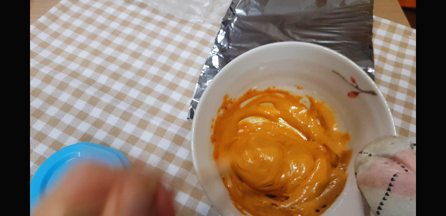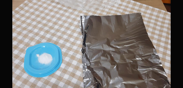 전자렌지가 돌아가는 동안 잽싸게 준비해 둘것 - 저어줄 나무젓가락, 바로 투입할 베이킹소다2g 저어서 부풀게되면 옮겨서 식혀줄 종이호일이나 쿠킹호일(담을만한 다른용기도 상관없음)을 준비해둔다.왜냐? 전자렌지에서 나온 그릇은 엄청 뜨겁기때문에 나오는 순간 순식간에 과정이 진행되기 때문에 미리 준비해놓지 않으면 이미 늦음,,ㅋㅋㅋ