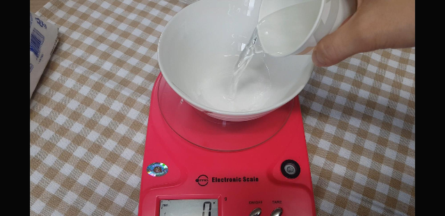 우선 저울을0으로 맞추고 전자렌지 용기를 올려 물을 25g넣어주고 바로 설탕을 40g넣어준다.