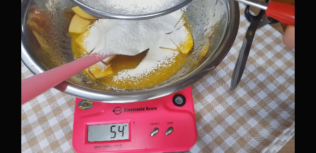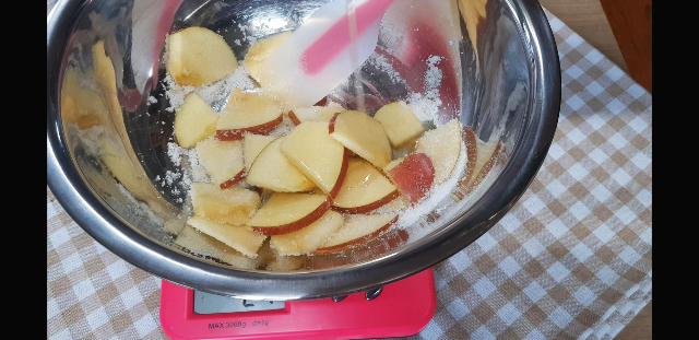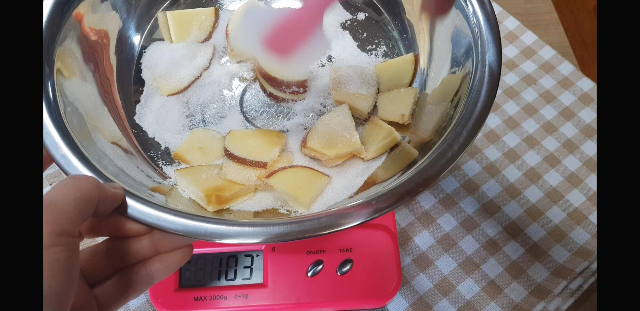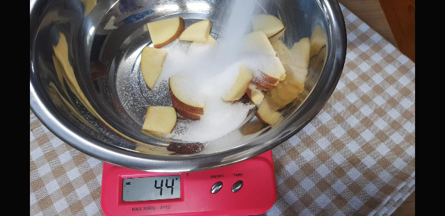 사과를 믹싱볼에 넣고 저울위에 올려 설탕을 50g넣어준다.