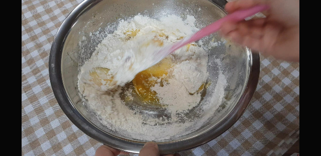 여기에 중력분 120g, 베이킹파우더 4g을 넣어준다.