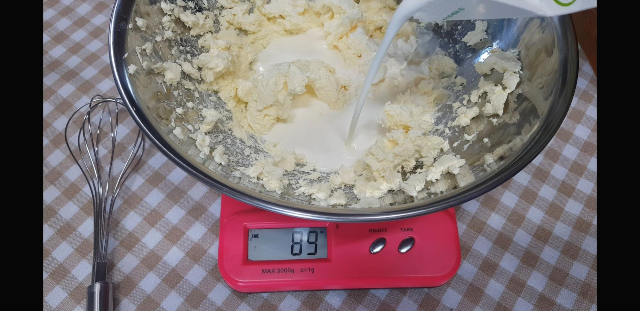 풀어준 크림치즈 위에다 생크림 120g을 넣고 거품기로 저어준다.