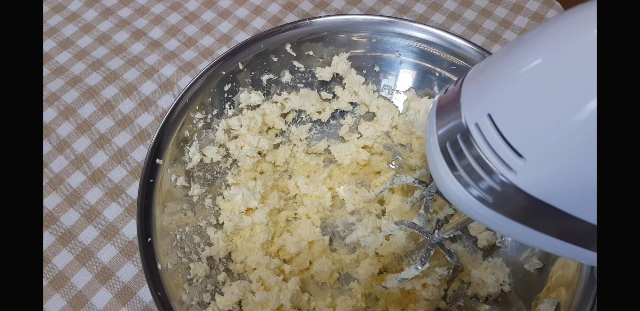 실온에 꺼내둔 크림치즈250g을 핸드믹서로 풀어준다.(이거미리 꺼내두지 않으면 고생각... 나는 넓은 볼밖에 없어서 어쩔수없이 넓은볼 썼는데 다튀어여.. 크림치즈 파티 덜튀는 좁은 볼을 사용하소서.)