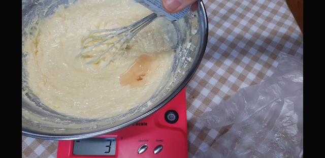 바닐라에센스 반큰술 레몬쥬스 반큰술 넣어주는데 레몬쥬스 반큰술은 생략했다. 마지막으로 골고루 섞어준 뒤