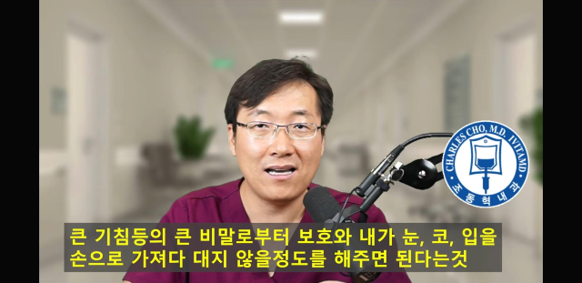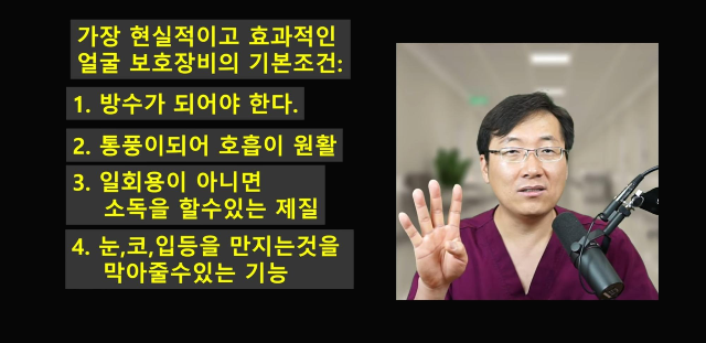 20분 가량의 영상중에 거두절미하고 우선 이분께서는 잘못된 마스크 착용을 할 바에는 차라리 안하는게 더 안전하다고 설명하셨고 끝까지 듣고나니 나름 끄덕끄덕 하게되어 마스크를 구하기 어려운 지금 사람들이 면이나 키친타올이나 티슈같은걸로 마스크를 만약을 대비해서 만들고 있는데 면이나 종이로 만든 마스크는 오히려 더 위험할 수 있다고 한다. 물방울을 떨어뜨렸을때 퍼지기 때문에 마스크 밖으로 침이 튄다고 해도 안쪽의 자기 입김으로 인해 마스크에 어느정도 수분이 있다면 밖의 오염물질이 그걸 타고 들어오면서 입과 코를 오염 시킬 수 있다고 한다. 이런 면에서 봤을때 오히려 마스크를 쓰지 않았을때 앞사람의 침이 묻었다면 그 바이러스는 손으로 밀어서 입과 코쪽으로 닦지만 않는다면 전염이 되지 않는다고 한다. 바이러스는 혼자서 움직일 수 없다고 한다.그리고 정말 미세한 비말은 일반 마스크도 막을수 없으며 미세 비말로 인해서 감염이 걸릴 확률은 적기 때문이라고.