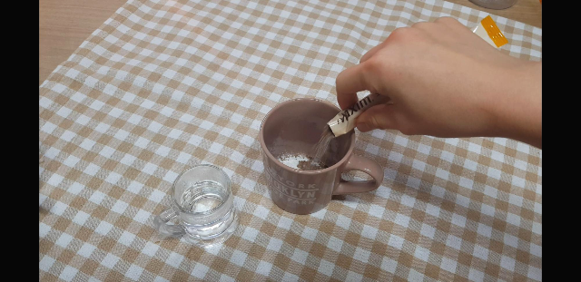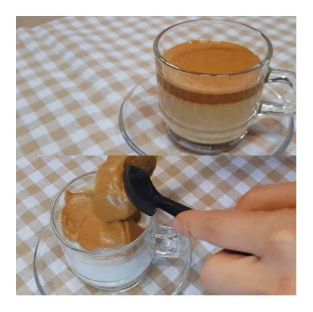 온수를 넣어주는데 나는 여기서 한번의 실패를 한다.뭐냐? 결론부터 말하자면 기존처럼 물을 소량만 넣었을때 결말이 대참사임. 어떻게 되냐면 완전 거얼쭈우우욱...해져서 달고나를 올리면 밑바닥으로 꺼져버림... 침몰해버린다. 여기서 나름대로의 나의 실험성공팁은 여기서 충분한 물을 넣어준다. 넣어준 믹스커피의 반정도나 반보다는 살짝 적게 넣어줘도됨.살짝 흥건하다고 해도 쫄지않아도 됨.