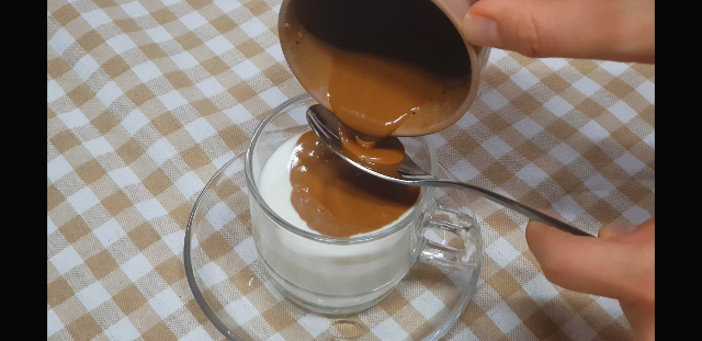그냥 올려도 되지만 그래도 더 살포시 실패하지 않고 예쁘게 올려주기 위해 스푼을 대고 그 위에다 쪼르르 부어줍니다.마치 음.. 오레그랏세 처럼?ㅋㅋ