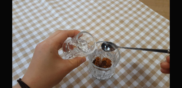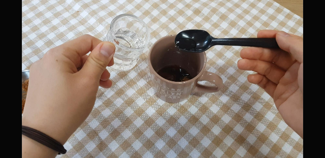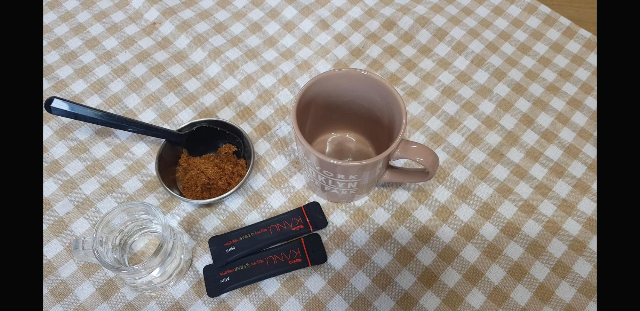 바로 준비모드. 사실 달고나 만든다고 카누를 몇개나 쓴건지 설탕을 몇그램이나 쓴건지 이젠 기억도 안나고요..ㅋㅋ 재료는 여전히 카누2개 흑설탕과 일반 정수물. 이전에는 온수로 썼는데 이번에는 차가운 물로 해볼거임. 찬물이다 뜨거운물이다 의견이 갈리는것 같아서 차가운 물로 흑설탕 달고나 라떼 고고