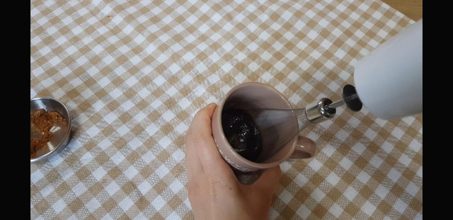 미니 전동 거품기가 없는 나는 일반 x립스 거품기를 켜줍니다. 흑설탕 달고나 라떼의 시작은 당연히 흑설탕 색깔이라 다크다크 합니다용.