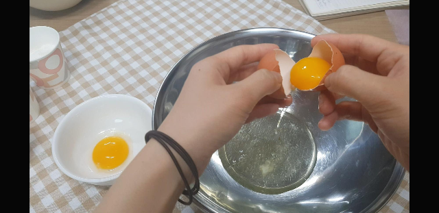 티라미수 수플레 팬케이크 까진 아니더라도 그냥 수플레 팬케이크를 만들어서 메이플시럽이나 과일올려 드실 분은 지금부터 따라하시면 됩니됴.. 우선 계란2개를 믹싱볼 2개에 각각 나눠담는다.(참고로 난 잠깐 믹싱볼 하나를 다른데 사용중이라 임시로 작은그릇에 했는데 나중에 옮겼음..꼭 넓은 믹싱볼에다가 하세여..ㅋㅋ)