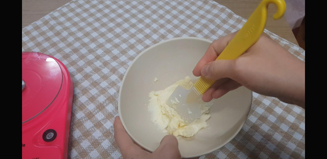 먼저 수플레 팬케이크 위에 올라갈 크림을 만들어 줄건데 여기에 사용될 크림치즈 40g은 미리 꺼내놓는게 좋다. 안그럼 크림화 시키는데 시간이 낭비됨.. 암튼 크림치즈40g에 설탕30g을 넣어서 으깨듯 요리저리 풀어서 부드럽게 만들어준 다음.