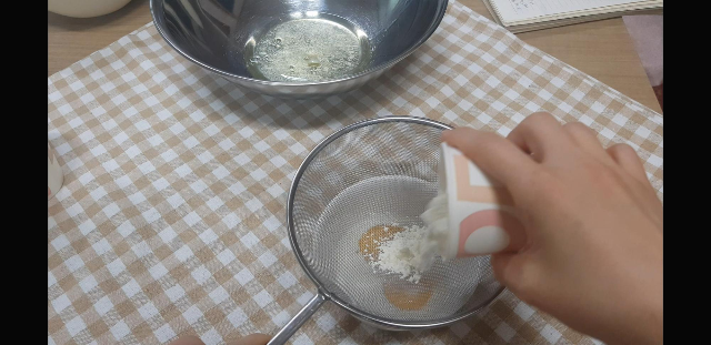 잘 섞어준다.(여기다 흰자머랭 섞을거라서 큰볼에다가 작업해야함)