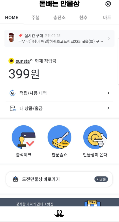 앱테크 추천 만물상 이라는 앱이다. 3천원부터 현금 출금도 가능하며 앞서 소개한 정신없는 어플과는 다르게 적립금환산 없이 그대로 사용이 가능해서 오히려 더 현실적이고 내가 스마트폰을 사용하는데에 지장도 크게 안 줄것 같아서 이 앱은 계속적으로 해볼 생각임...매일 출석체크를 1원씩 10일을 연속으로하면 30원을 추가로 지급되는 깨알 이득도 있고 매일 편의점 상품 하나씩 참여응모해서 당첨되는 만물상이 쏜다 타임에는 푸시알림도 되니 알림뜨면 한번씩 해보는 재미도 쏠쏠한듯.