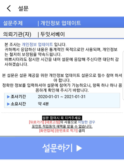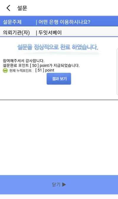 앱테크 추천 두잇세베이 라는 설문참여 하면 돈이 쌓이는 앱이다. 약간의 상세한 정보를 입력하면 거기에 맞는 설문 참여가 나오게 되고 각 설문에 따라 소요되는 시간도 나온다. 설문 장르에 따라 별 생각 안하고 내가 생각하는 그대로를 체크하면 끝나는거라 내가 잠깐이라도 틈나는 시간을 이용해서 설문 참여를 하면 다른 적립 앱과는 다르게 나름 적지않은 돈이 쌓인다. 4분 설문참여 하고 50원이면 괜찮은것 같다.ㅋㅋ 그리고 일반적인 앱과 동일하게 포인트 충전소에서 앱을 설치하고 지급받는 방식도 있고 아직 내눈에는 마감된 설문이 대부분이고 참여할 수 있는 설문은 많이 없었지만 앞으로 계속 생길듯 하다. 1만원 이상부터 출금가능함.5만원 이하일 경우에 이체 수수료 500원제외.5만원초과일 경우 소득세 3.3%제외한 나머지 금액이 입금된다. 돈버는 어플 앱테크 추천ㅋㅋ